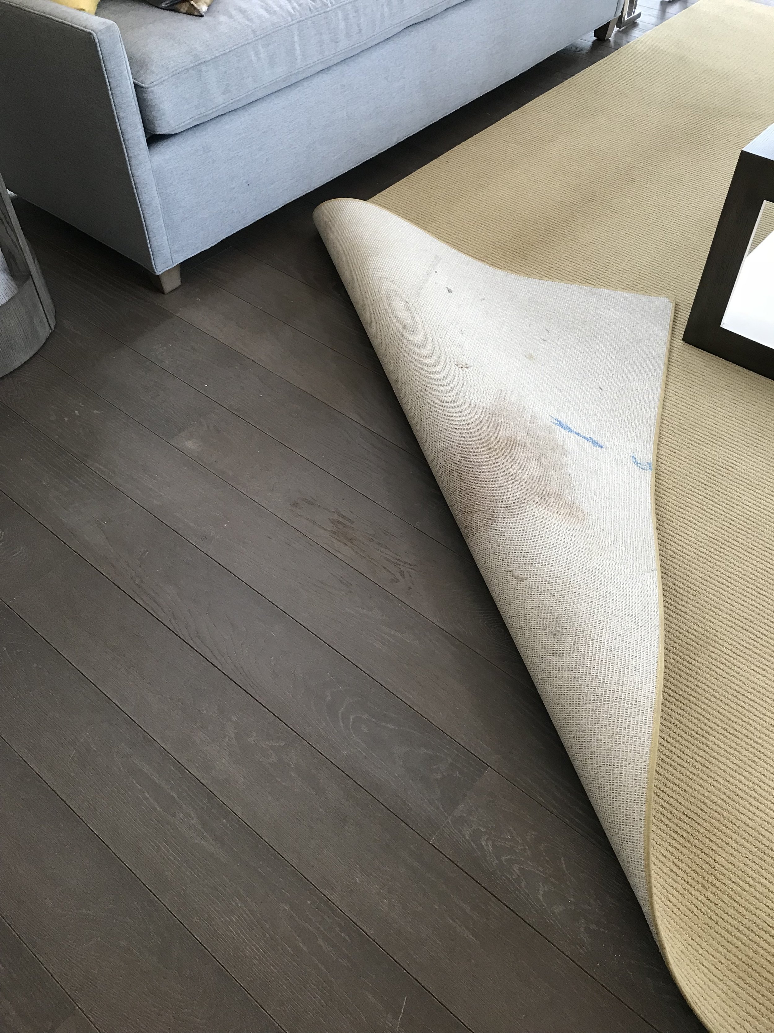 In the second image, you can actually see the spill has caused damage to the laminate hardwood floor underneath the rug. When you spill a large amount of liquid on an area rug, it is important to lift the rug to dry underneath. This image also shows the soiling present on the back of the rug, which must be addressed.
